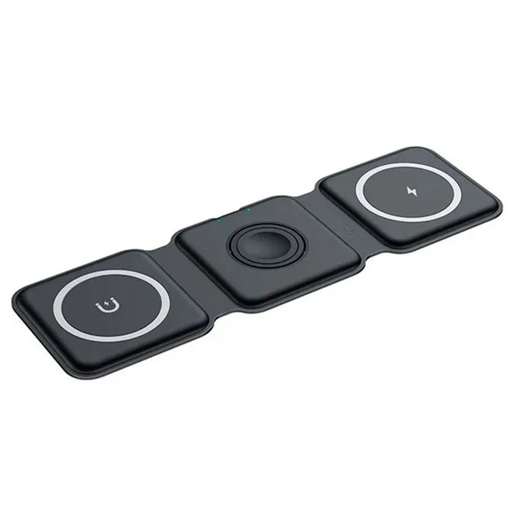 Descripción: Cargador inalámbrico Qi 3 en 1 para smartphone, smartwatch y auriculares. Integrado por 3 módulos de carga. Función de plegar 180 grados para convertirse en un soporte de teléfono.