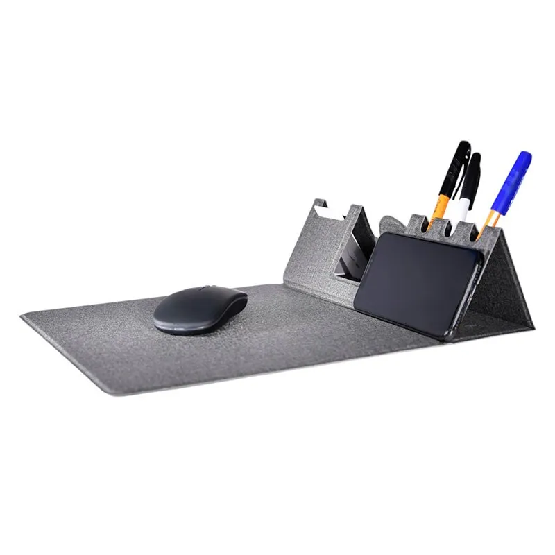 Descripción: Mouse pad multifuncional con carga inalámbrica: plegable e impermeable, cuenta con soporte para tarjetas y teléfono, bandeja para bolígrafos, interfaz de carga y superficie de precisión para el mouse. Incluye cable tipo C.